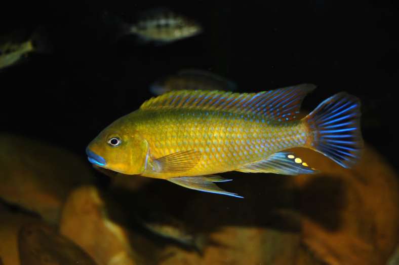 This fish is one of the cichlids from Lake Malawi that are called Mbunas. The Tonga people of Malawi named these fish Mbuna, as that term means “rockfish” or “rock-dwelling”. This name aptly describes the environment these fish live in. They inhabit rocky areas full of cracks and crevices, as opposed to being open water swimmers like the Utaka cichlids and other “haps”. There are 13 genera full of very active and aggressive personalities of Mbuna cichlids. Other common names this fish is known by includes Doctor’s Cichlid, Metriaclima Daktari, Pseudotropheus Daktari, as well as Metriaclima sp. “daktari“, and of course Mbuna.