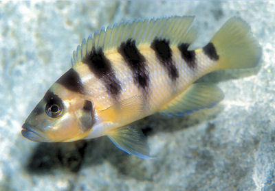 The Sexfasciatus Neolamprologus sexfasciatus is without a doubt one of the most attractive Lamprologini cichlids imported from Lake Tanganyika, Africa. There are several geographic color variations depending on where it originates in the lake. But overall It is an elongated, somewhat stocky cichlid with six bold black bars on a silver to white, or gold background. it is further highlighted with touches of blue.
