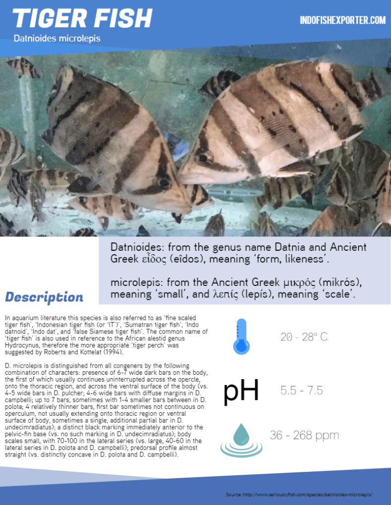 Индонезийский тигр рыба растет большой, и это также является активным вид. Это лучше держать его в качестве единого образца. Также можно держать их в небольшой группе, по крайней мере, три или четыре рыб, чтобы рассеять любое агрессивное поведение. Очень большой аквариум нужно держать небольшую группу обзоров этих рыб. Индонезийской Тайгер Рыба является высокой спинкой рыбы с боковым сжатием. Цвет тела белого до желтовато-коричневого цвета с пятью широкими черными вертикальными полосами. Первая проходит через глаз, в то время как последние знаки хвостовом стебле. Образцы из Юго-Восточной Азии неизменно пять полных баров, образцы из Борнео с шести до семи баров, все, как правило, продолжается через брюшную поверхность тела. Также они будут пытаться съесть любую рыбу, которая будет вписываться в Обзоры рта. Учитывая индонезийский тигр рыбы как солоноватые водные виды является распространенной ошибкой. В это естественная среда обитания живет в пресной воде, но она может выжить в условиях солоноватой слишком мягко.
